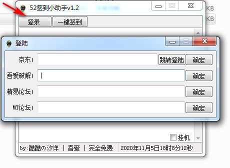 运行软件后登陆账号,支持京东、吾爱、精易论坛、MT论坛