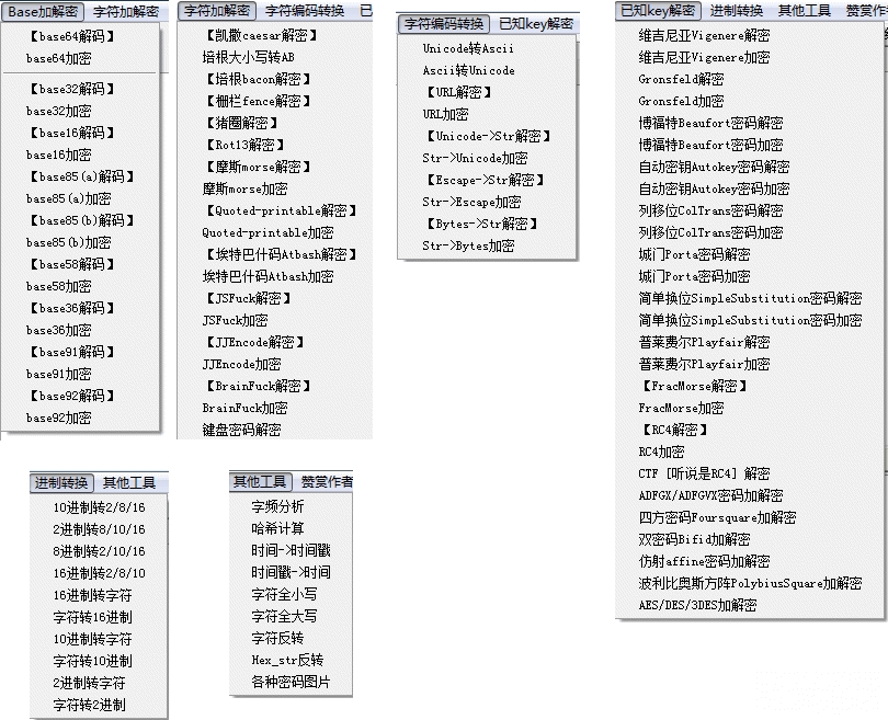 各种编码解码离线工具集成:包括base64,base32,base16,base85(a),base85(b),base58,base36,base91,base92,培根bacon,摩斯,键盘,猪圈,Rot13,Quoted,Atbash,JSFuck,JJEncode,BrainFuck,URL,Unicode-str,Unicode-Ascii,Bytes,Escape,栅栏fence,凯撒Caesar。维吉尼亚,Gronsfeld,博福特,自动密钥,列位移,城门,简单换位,普莱费尔,FracMorse,Rc4,ADFGX/ADFGVX,双密码,仿射,波利比斯,AES/DES/3DES