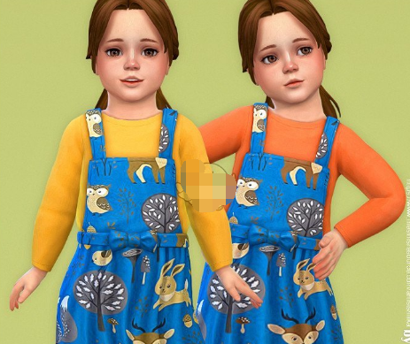 模拟人生4可爱小动物吊带连衣裙MOD是专为模拟人生4游戏中的小女孩制作的一个服装类游戏补丁,安装进游戏后就能给她们穿上一件童趣满满的背带连衣裙,具体效果如下图,蓝色牛仔的面料,上面印了非常多的人都在使用卡通动植物图案,有小兔子、小鹿、小树和小蘑菇等等,超级可爱!