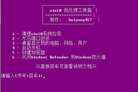 win10批处理工具箱是网友开发的系统优化合集软件,用于清理垃圾、查杀病毒、用户系统等,直接回车可查看说明文档,打开批处理请耐心等待运行完成!