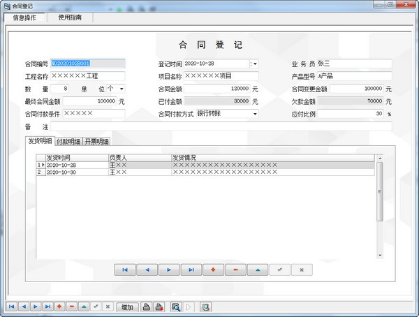 数据统计:规定天数未收款、发货未收款合同、查询收款明细、统计合同金额。