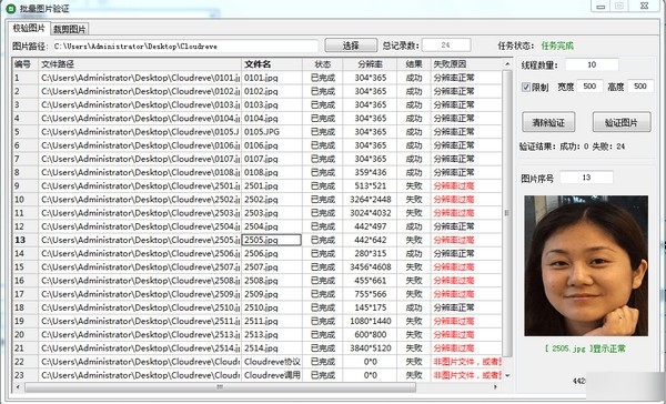 批量图片验证是一个相当高效的批量验证图片分辨率的小工具,可以帮助用户一键验证多张图片是否符合指定分辨率,使用方法也十分简单,只要将需要检测的图片都放进同一个文件夹,然后在软件中设定图片文件夹路径,开始校验,校验后进行裁剪,即可裁剪完成。