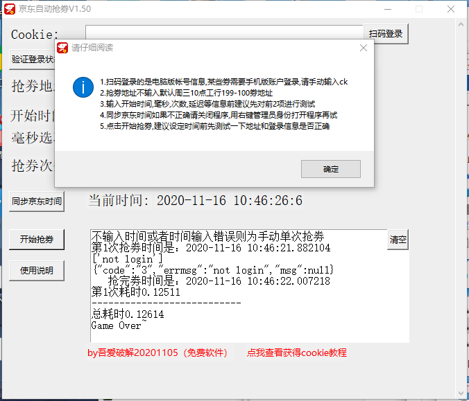 支持手动和二维码扫码获取登录信息,抢券时间,次数,延迟都可以自定义,但建议延迟不能过低,否则会出现火爆的情况,不输入地址默认京东周三10点工行199-100劵