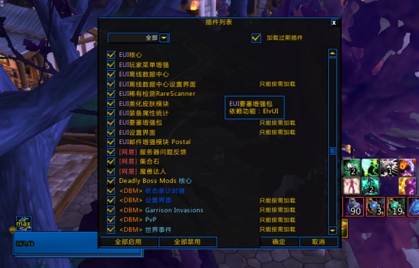 4、启动游戏,进入角色选择画面,点击左下角的插件按钮,勾选[集合石]模块并确定。