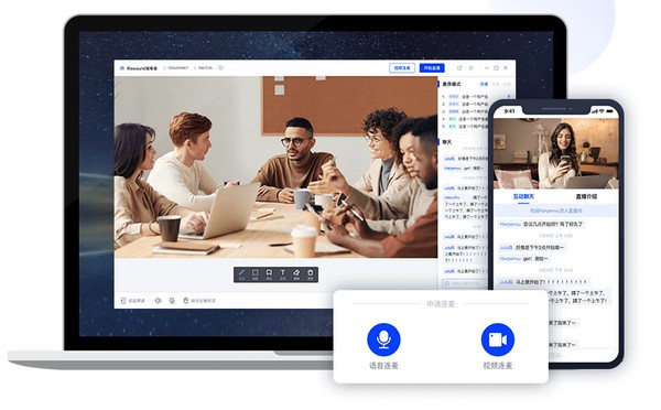 支持直播频道管理、多类型直播(文档、桌面共享、音视频)、音视频连麦互动、互动聊天;