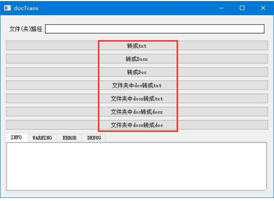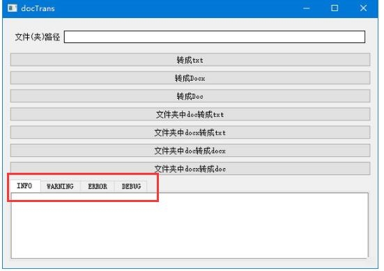 docTrans支持doc、docx转txt(utf-8格式)doc和docx相互转换将文件夹中的文件批量转换,对于有需要的用户们来说是一个非常非常实用的Doc格式转换器,使用方法具体的步骤小编都在下文做了详细的图文介绍,非常简单,将文件拖入后点击相应的按钮就可以,欢迎下载使用~