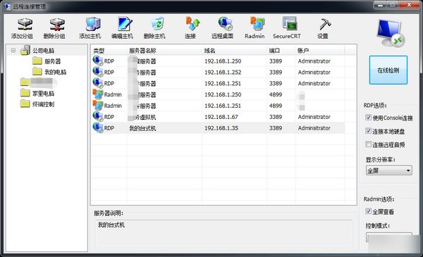 远程连接管理软件,支持远程桌面、RADMIN、SSH主机的管理,双击主机即可打开连接,RADMIN主机的右键菜单中加入完全控制、仅限查看、文件传送、远程关机多种功能,而且软件无联网功能,支持软件打开密码,数据库的中密码已加密存储,可以放心使用。