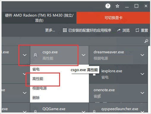 3.然后在已安装好的配置好的应用程序中选择你想要高性能运行的程序,点击后,选择【高性能】即可。