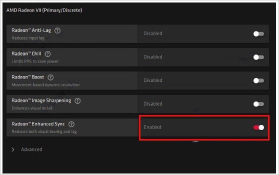 Radeon增强同步,当帧速率超过显示器的刷新速率时,减少屏幕撕裂和延迟。要打开此功能,请将Radeon Enhanced Sync设置为Enabled。如果你的显示器的刷新率低,则将其关掉。