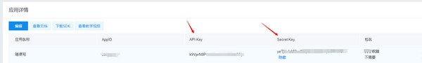 然后查看应用详情里,就能看到APIKEY和SECRETKEY了,复制到软件中即可。
