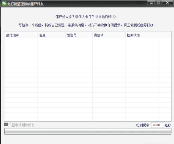 1、零打扰检测僵尸粉:僵尸粉检测过程中对好友无任何打扰,针对检测出的僵尸粉,可批量发送好友验证。