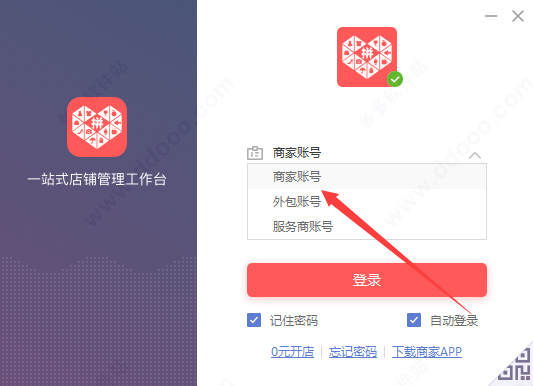 1、在本站下载安装拼多多一站式店铺管理工作台,在进行登录时,用户可以选择商家账号、者外包账号或服务商账号;