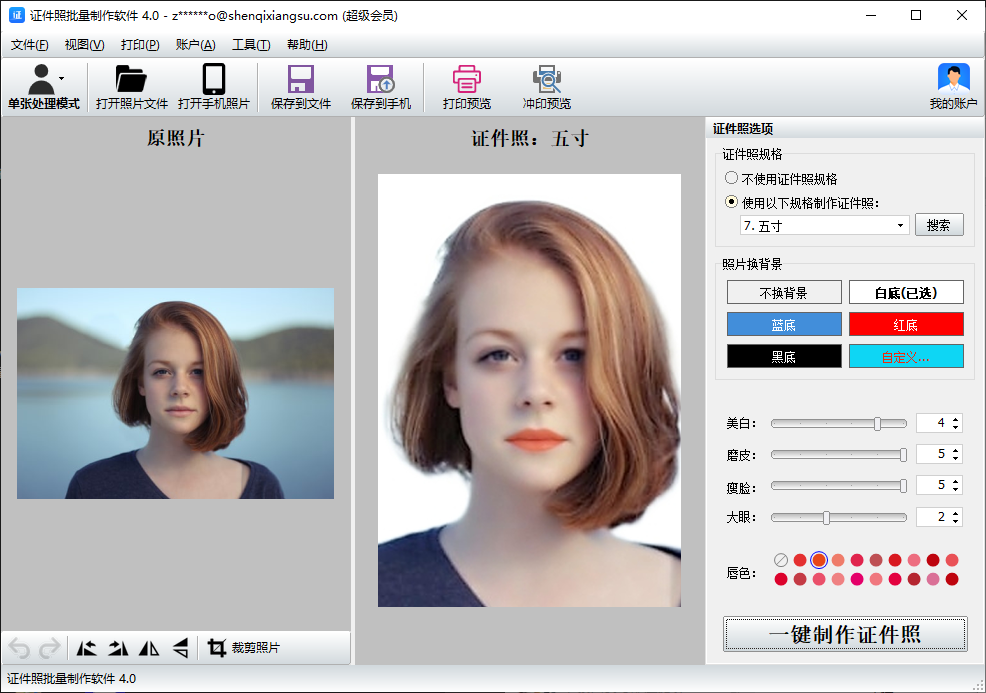 1.单张处理模式,选择好要生成的规格尺寸,背景颜色等,点击“一键制作证件照“: