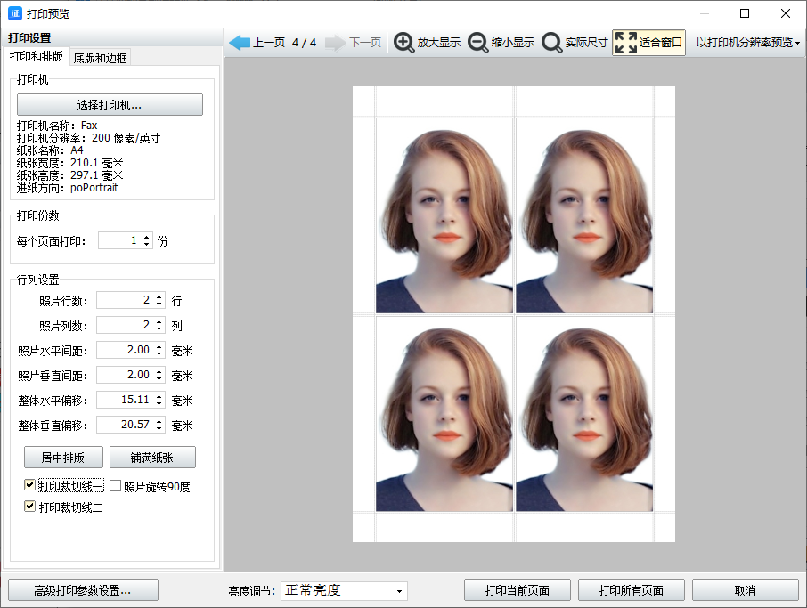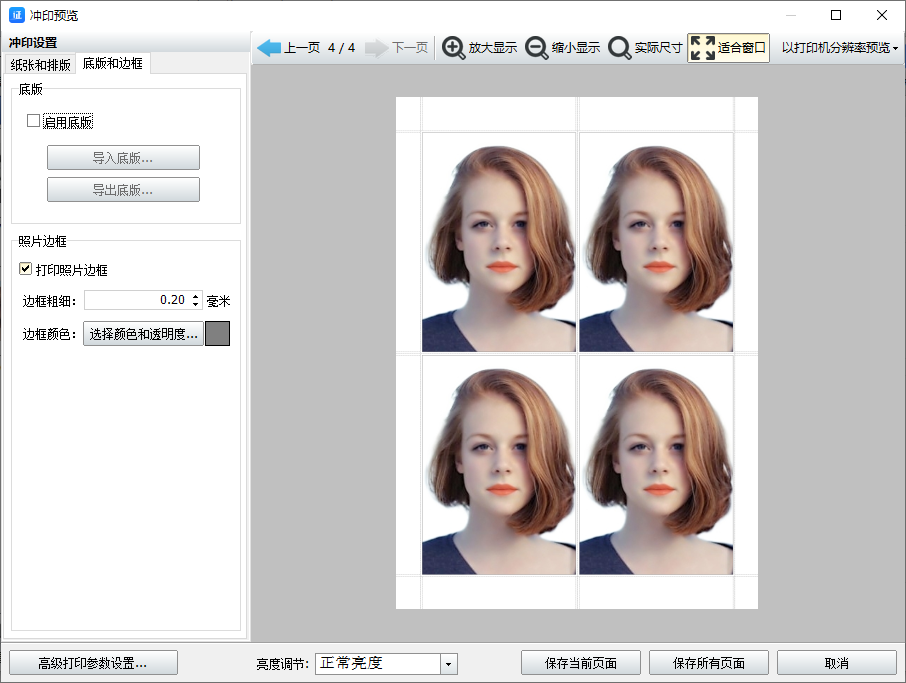 4.点击"冲印预览“,可以设置纸张的大小,并对照片进行排版,并且可以加入底板和设备边框,如下图所示: