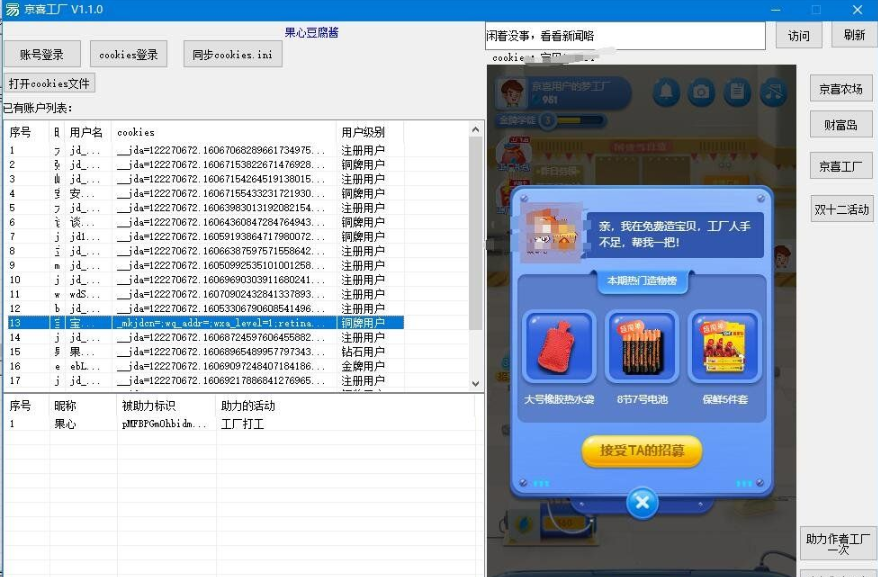 京喜工厂小工具对于喜欢褥羊毛的小伙伴们来说一定是一个非常不错的助力软件,其主要用于褥羊毛互助,虽然目前只支持工厂和厂长助力,但是也差不多够用了,具体的使用方法小编已经在下文说明了,有需要的朋友们可以在本站下载该软件,然后按照使用教程操作就可以顺利助力了哦~