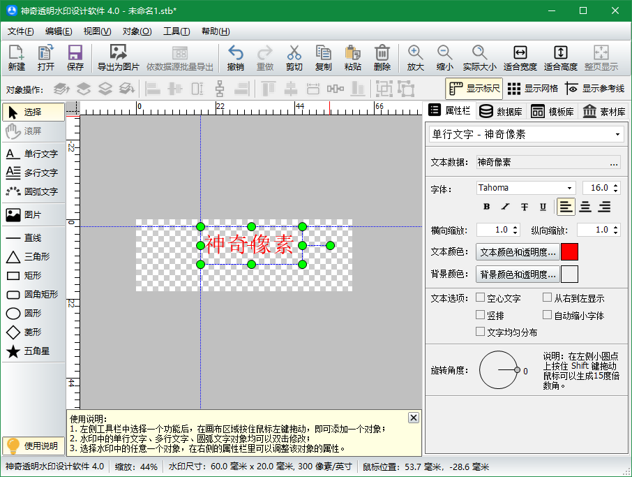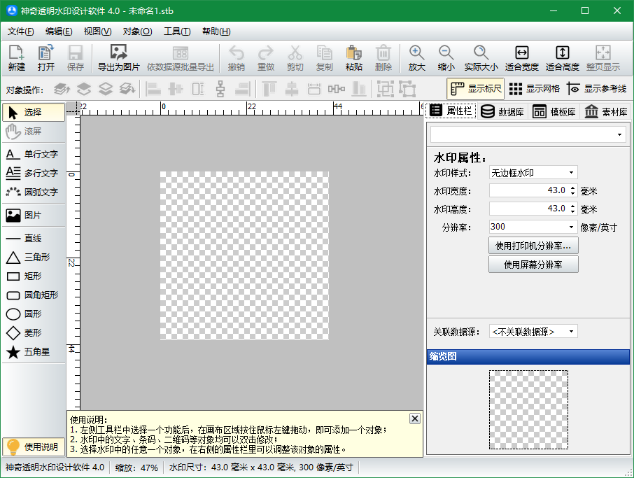软件界面主要由标题栏、操作按钮区域、工具栏、透明水印编辑区域、属性栏、模板库、素材库、缩览图等区域构成。其中最常用的是工具栏、属性栏和透明水印编辑区域。