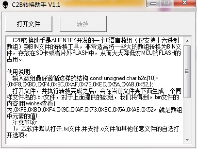 C2B转换助手是ALIENTEK开发的一个c语言数组(仅支持十六进制数组)到bin文件的转换工具,非常适合将一些大的数组转换为BIN文件,存放在SD卡或者片外FLASH中,从而大大降低对MCU的FLASH的占用。
