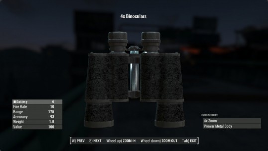 辐射4中的配件可以通过商人进行购买,大部分道具会有各种类型的配件槽,可以装上改造配件,现在为大家分享的辐射4战前双筒望远镜MOD能够对辐射4中的望远镜进行增强,玩家使用后可以增加战前双筒望远镜模组召唤民兵炮兵支援的功能,还有一些额外的东西。