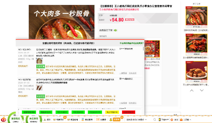 防刷刷插件会对当前商品页面已经加载的评价进行分析,把不太靠谱的评价(如刷单评价、好评返现评价、广告评价等)过滤掉,剩下比较可信的评价,同时会按照评价的参考价值对可信评价进行排序,帮助使用者更快了解商品的优缺点。