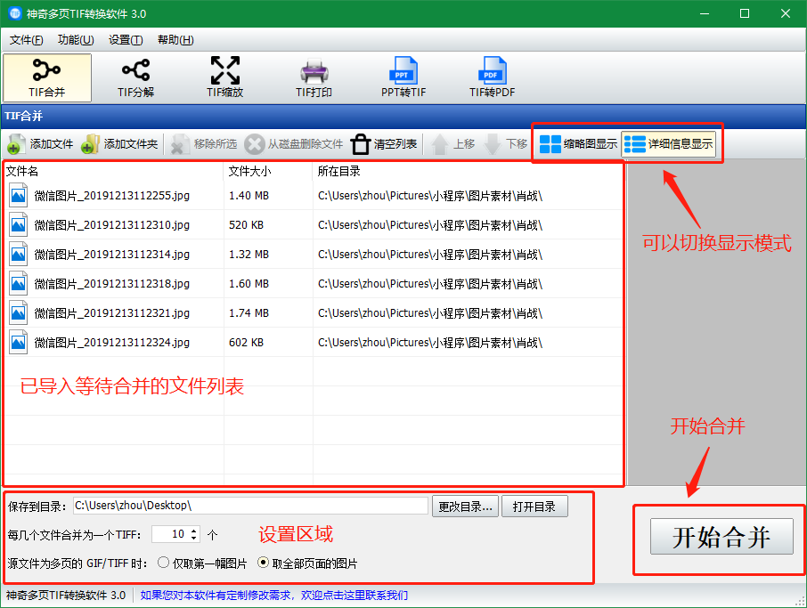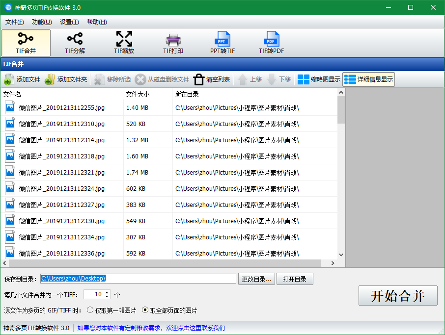 软件中选中“TIF合并”功能模块,点击“添加文件”按钮,选择需要处理的图片导入,软件会列出已导入的图片列表。设置保存目录、设置每几张图片文件合并到一个TIF文件中,如果源文件中包含GIF图片或TIF文件,则可以设置,取此文件中的第一张或者全部图片合并到TIF中。设置完毕后,点击“开始合并”等待完成即可。