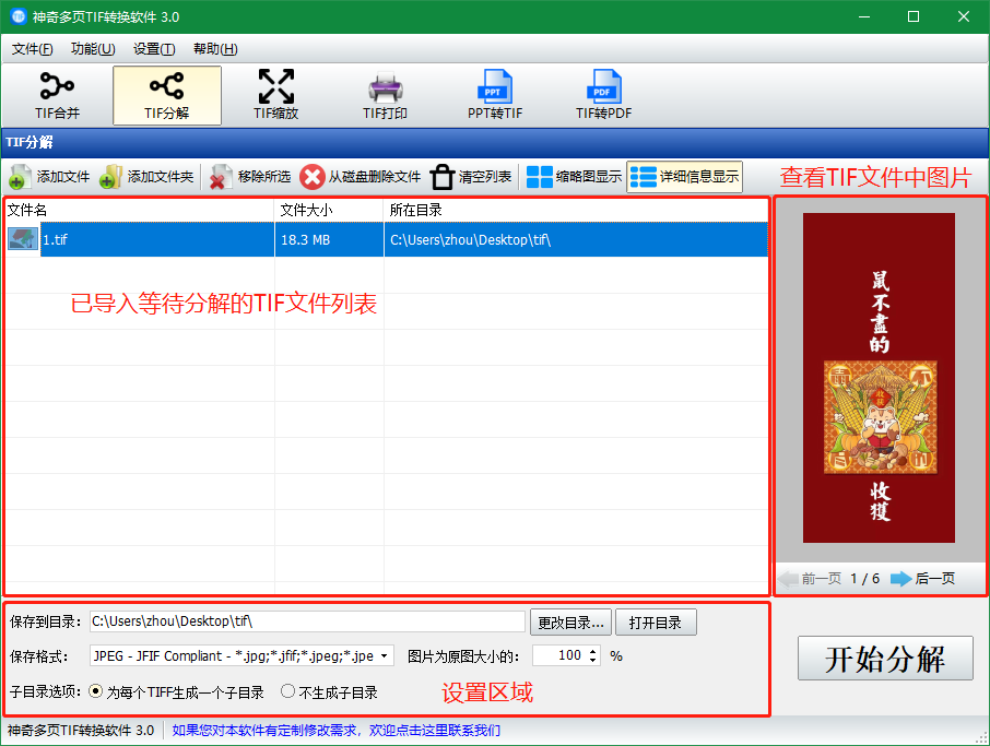 TIF分解功能:将TIF文件分解为多个图片文件,支持设置分解后的图片格式和保存目录;