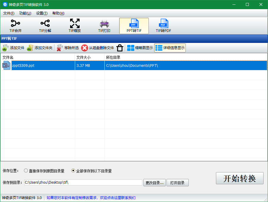 软件中选中“PPT转TIF”功能模块,点击“添加文件”按钮,选择需要转换的PPT文件,可以多选批量处理。支持设置保存位置和目录,设置完成后点击“开始转换”按钮,等待完成即可。