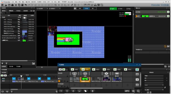 Hirender S3的资源管理包含素材库、屏幕管理、节目特效、设备管理、输入控制以及图片一键优化等功能。可以在素材库里面添加视频、图片、PPT、采集卡、NID网络屏幕、字幕等,并实现对素材的删除、添加、排序等操作。屏幕管理可查看屏幕信息和状态。节目特效可增加素材的灵活多变性。设备管理可查看设备的状态和处理器占用。输入控制可以编辑普通控制和MIDI控制等。节目列表功能非常方便节目便捷快速浏览。右下角的一键优化按钮开关可以实现对图片的优化。节目插播可以辅助时间线使用,非常方便临场节目修改,也可实现现场摄像等信号切换(导播)。