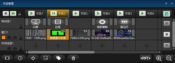 通过对节目管理中的窗口进行编辑,可以生成对应的节目,进而实现节目流程的切换,使LED大屏显示不同效果。节目列表和节目图层可以无限添加:窗口里面可以播放包括视频、图片、字幕、音频等内容,特效图层可以添加各种特效,流程标签层标记更多流程可以让节目更明确细致。另外右下角的PPT全局翻页,可在软件任意界面控制PPT的播放,非常方便快捷。