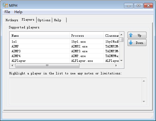 3)在玩家选项卡上,您可以使用向上和向下按钮设置玩家的顺序。这很非常重要的,因为MPH按顺序评估该列表,现有进程的第一个匹配将是由热键控制的进程。例如,假设您的计算机上同时运行了Winamp和Foobar。如果Winamp条目在列表中的Foobar条目之上,Winamp将是由热键控制的应用程序。