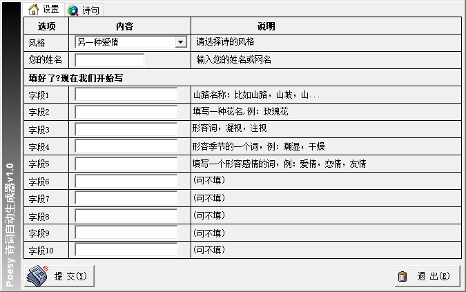 2、设计的36种身份则有朦胧诗人、纯情诗人、新鸳鸯蝴蝶派诗人、闷骚诗人等。此外还需要按照风格输入几种花名、几种颜色名、几个动词和几个形容词作为关键词。