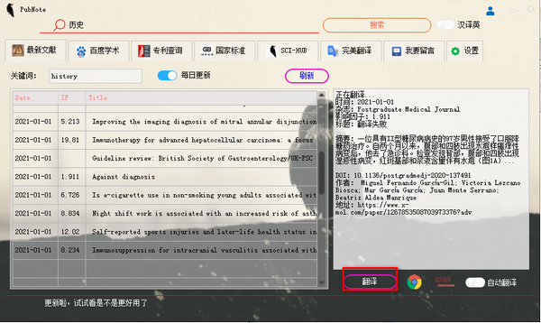 可以点击翻译按钮进行翻译,也可勾选自动翻译按钮进行自动翻译。支持调用sci-hub进行下载。