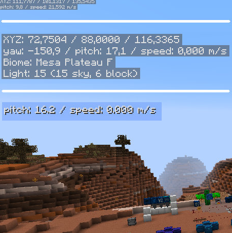 我的世界是一个可玩性非常强的沙盒游戏,游戏中玩家可以在一片未开发过的土地上自由的建造建筑,打造出一个自己理想的世界,非常有趣,今天带来的我的世界迷你HUD界面MOD就是专为该游戏制作的一个辅助类补丁,“F3”的迷你版本,对于喜欢开F3但是觉得影响视线的小伙伴来说非常非常实用!