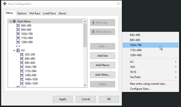 热键:Sizer操作,包括带出主调整大小菜单,可以分配给一个热键,可以在任何时候使用。例如,默认情况下,按Ctrl+Win+Z会带出Sizer上下文菜单。这就省去了你猎取窗口边框来右击它。