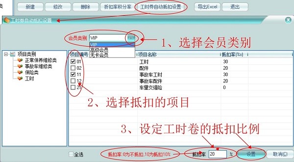 7、促销功能:工时劵和现金卷可设定每次消费使用的比例!积分可直接抵扣现金!