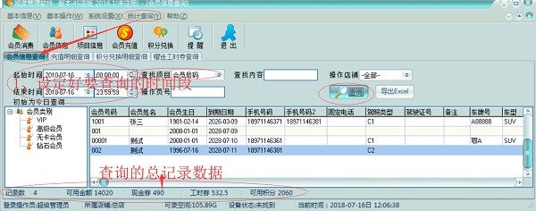 8、账目查询:可设定时间段、收银员、针对每个客户等不同查询条件,来查询客户的积分、充值、赠送工时劵、消费等的数据!汇总的数据可导出Excel格!