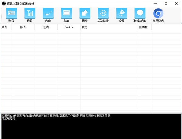 信息之家B2B自动发帖是一个非常非常实用便捷的自动发帖小工具,主要面向在B2B论坛网站运营内容的小伙伴们使用,可以帮助大家更加轻松高效的完成内容运行工作,支持自定义账号、标题、内容、段落、图片等设置,使用方法也十分简单,具体教程小编在下文详细介绍了,快来看看吧~