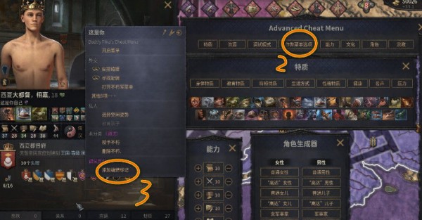 十字军之王3是以中世纪为背景的一个策略类角色扮演游戏,游戏中玩家需要通过各种手段及战术慢慢发展壮大自己的王国,玩法是蛮有意思的,今天带来的十字军之王3高级作弊菜单MOD就是一个该游戏的辅助性补丁,可以自由修改人物的属性、特质、性格、健康、名声等。