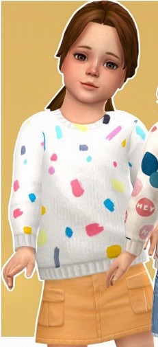 模拟人生4小女孩舒适印花毛衣MOD非常适合模拟人生4中的女性儿童角色使用,补丁的作者在游戏中制作添加了一件新的服装外观,玩家使用后就能给小女孩穿上一件新毛衣,毛衣上面带有可爱的印花图案,款式比较简单,小孩子穿效果很不错,看起来也非常舒适,可以参考下面的图片~