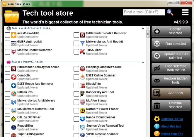 Tech Tool Store包含了500多个技术人员教学工具,全部是免费提供给用户使用的,您只需要简单的点击几下就可以快速完成配置、更新、组织和运行所需的工具,由于工具比较多,有一些暂时用不到的可以加在隐藏列表中,非常非常方便,而且软件不需要任何安装,完全可移植,可以将它移动到您的工具包的大容量存储设备。