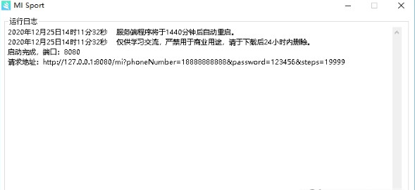 http://127.0.0.1:端口号/mi?phoneNumber=手机号&password=密码&steps=步数