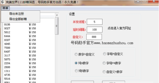 软件是针对最近刚开放的完美世界111邮箱打造的靓号筛选工具,可以帮大家抢先注册到邮箱靓号;