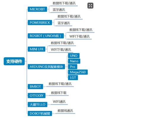 支持市面上的开源硬件或者热门的教育硬件,Microbit,Arduino等等...不拘束用户的硬件选择,给予最开放的环境让用户进行创作。支持九大类硬件!支持多种方式通讯,支持用户自主添加插件。