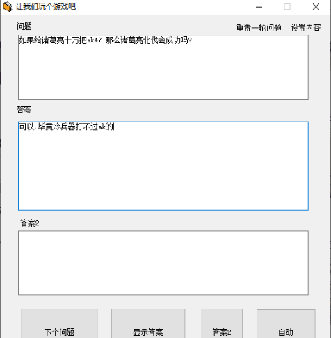 让我们玩个游戏吧是一个自问自答的小工具,由网友原创制作,能够用来进行聊天和娱乐等等,用户想问什么问题,在软件中输入就能够获得相应的答案了,给出的答案都是非常有趣的,不但能够当作学习软件,还可以用来和朋友聊天,支持用户自定义设置问题和答案。