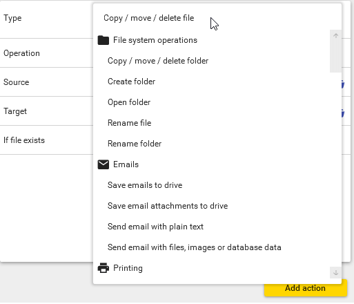 任务编辑界面可选操作非常多的人都在使用,如创建文件夹、重命名文件、打印文件、运行程序、执行脚本(python、vbscript、javascript、powershell等)、锁定注销重启系统、发送通知等等,可以添加多个操作。