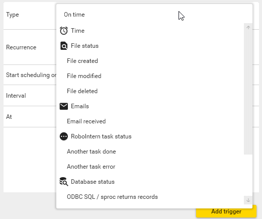 选择操作类型触发器类型可以设置为按时间、文件状态、邮件接收、另一个任务的状态、计算机启动等。