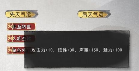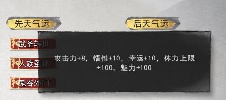 鬼谷八荒超稀有三红气运存档能够为喜欢鬼谷八荒的玩家们带来功能非常强大的存档,这款存档由“青铜沙漏”制作并分享,玩家使用之后就能使游戏中的属性变强,获得武圣转世、鬼谷外门、人族圣体三红超稀有资质,幸福满值200,悟性在三红的基础上增加了二三十,脚力加了200。