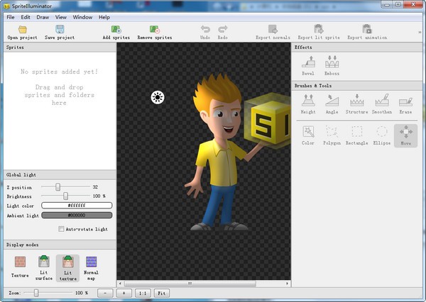 SpriteIlluminator能够在2D图像上生成细节程度较高的动态照明和反射效果,还提供了斜角、浮雕、油漆工具、角度刷、高度刷、平滑刷、魔杖、多边形套索等功能,十分强大,轻松制作出生动的3d效果图,既节约成本也节约经历,用户满意度也随之提高,欢迎下载使用哦~