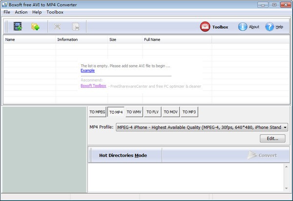 Boxoft free AVI to MP4 Converter提供两种非常方便的模式供您使用:批量转换模式和热目录模式。批量转换模式用于一次转换一组文件。热目录模式可以帮助您在后台自动转换AVI文件。