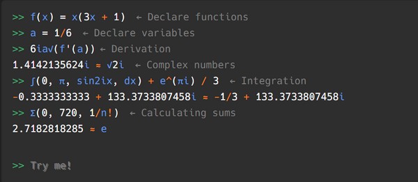 支持类似数学的语法和复数的计算,包含定义的变量、函数、推导、积分和复数。