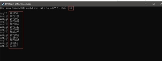 每输一个数字要回车一次,共26行,这26个ID,其中第一个是游戏ID,后面25个是DLC的ID;DLC编号来源:https://steamdb.info/app/981750/dlc/);